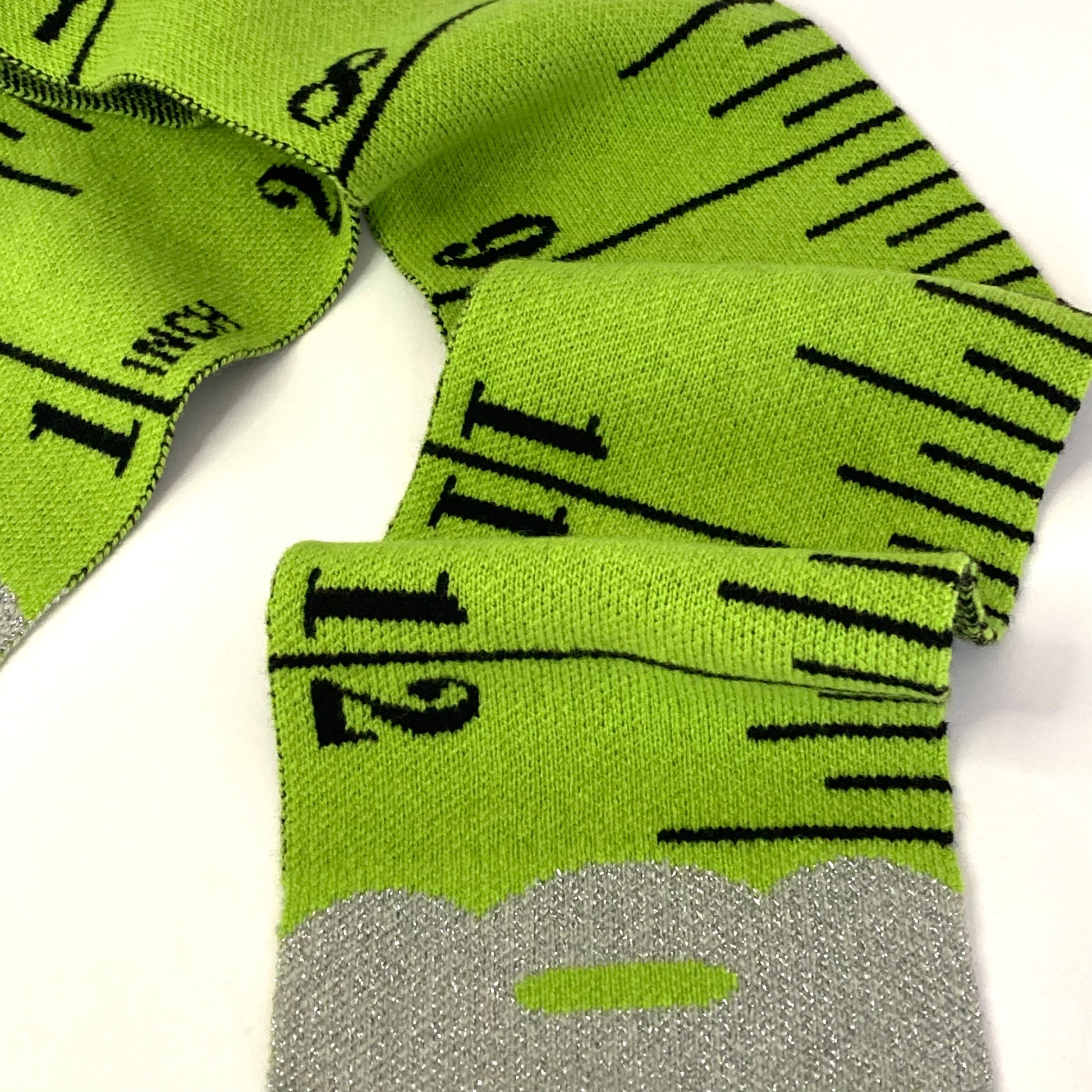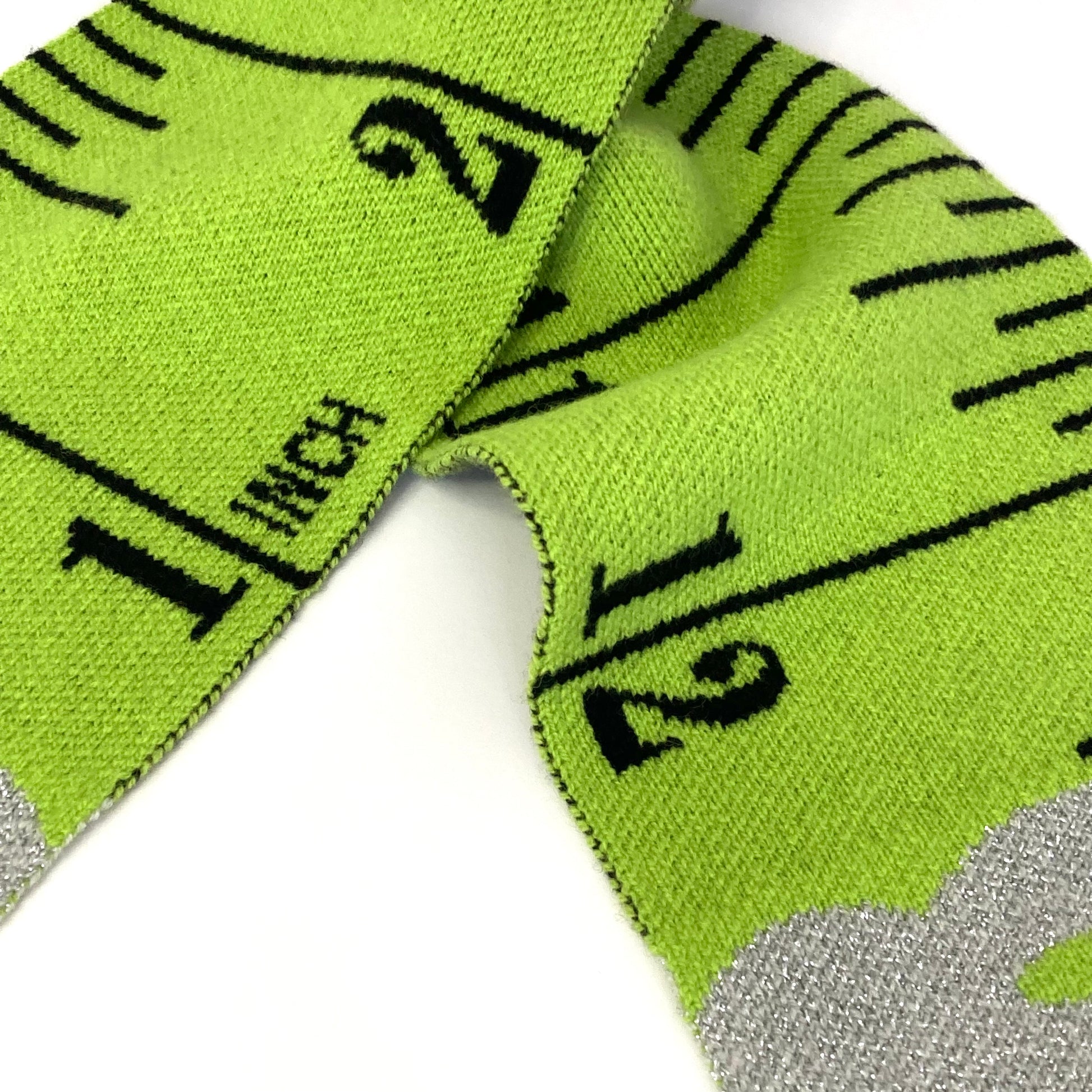 This extra large knitted tape-measure scarf is sure to keep you warm; featuring bold inch measures as well as metallic ends...it's taking novelty to the next level!
