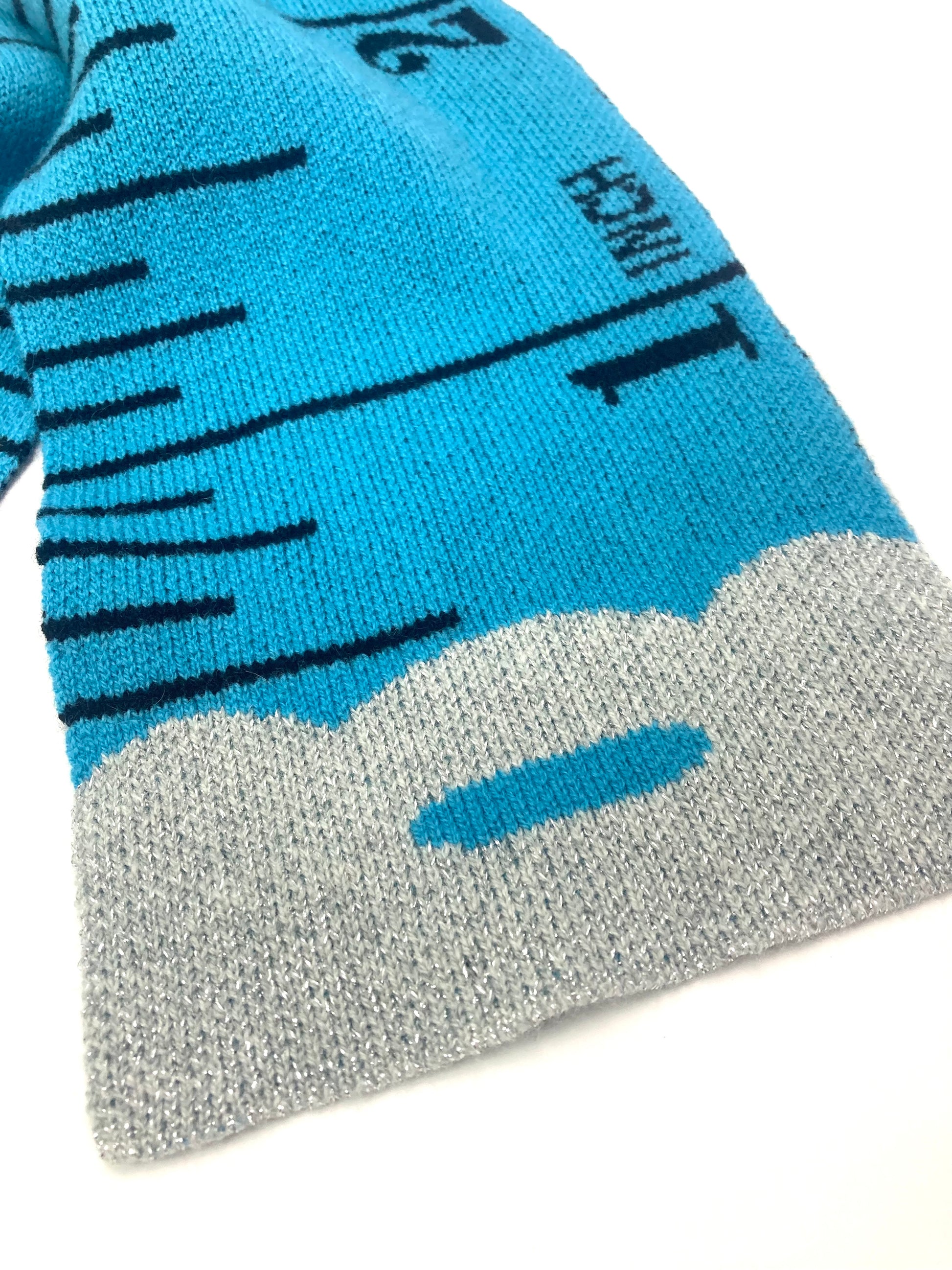 This extra large knitted tape-measure scarf is sure to keep you warm; featuring bold inch measures as well as metallic ends...it's taking novelty to the next level!