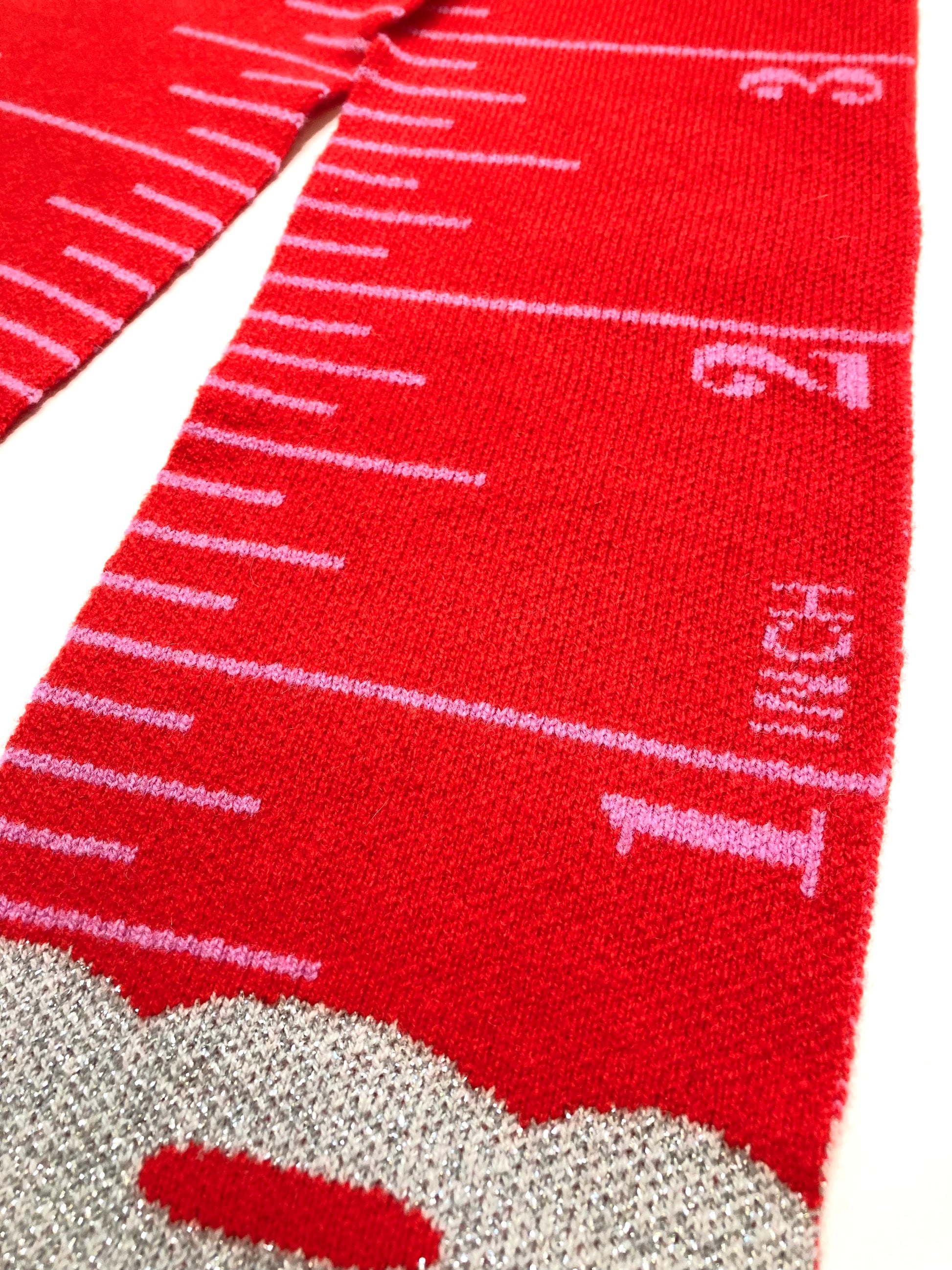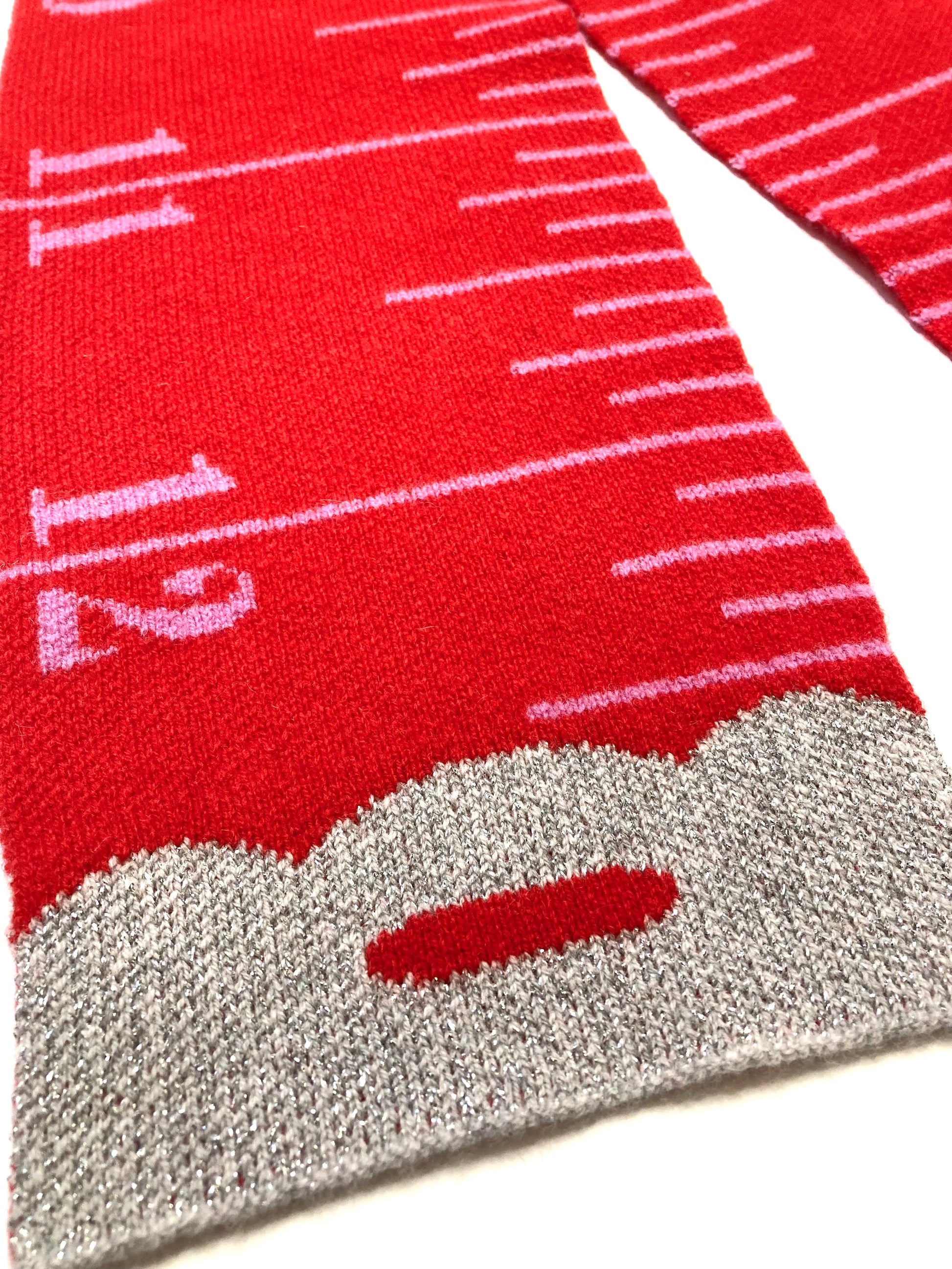 LIMITED EDITION RED AND PINK!!! This extra large knitted tape-measure scarf is sure to keep you warm; featuring bold inch measures as well as metallic ends...it's taking novelty to the next level!