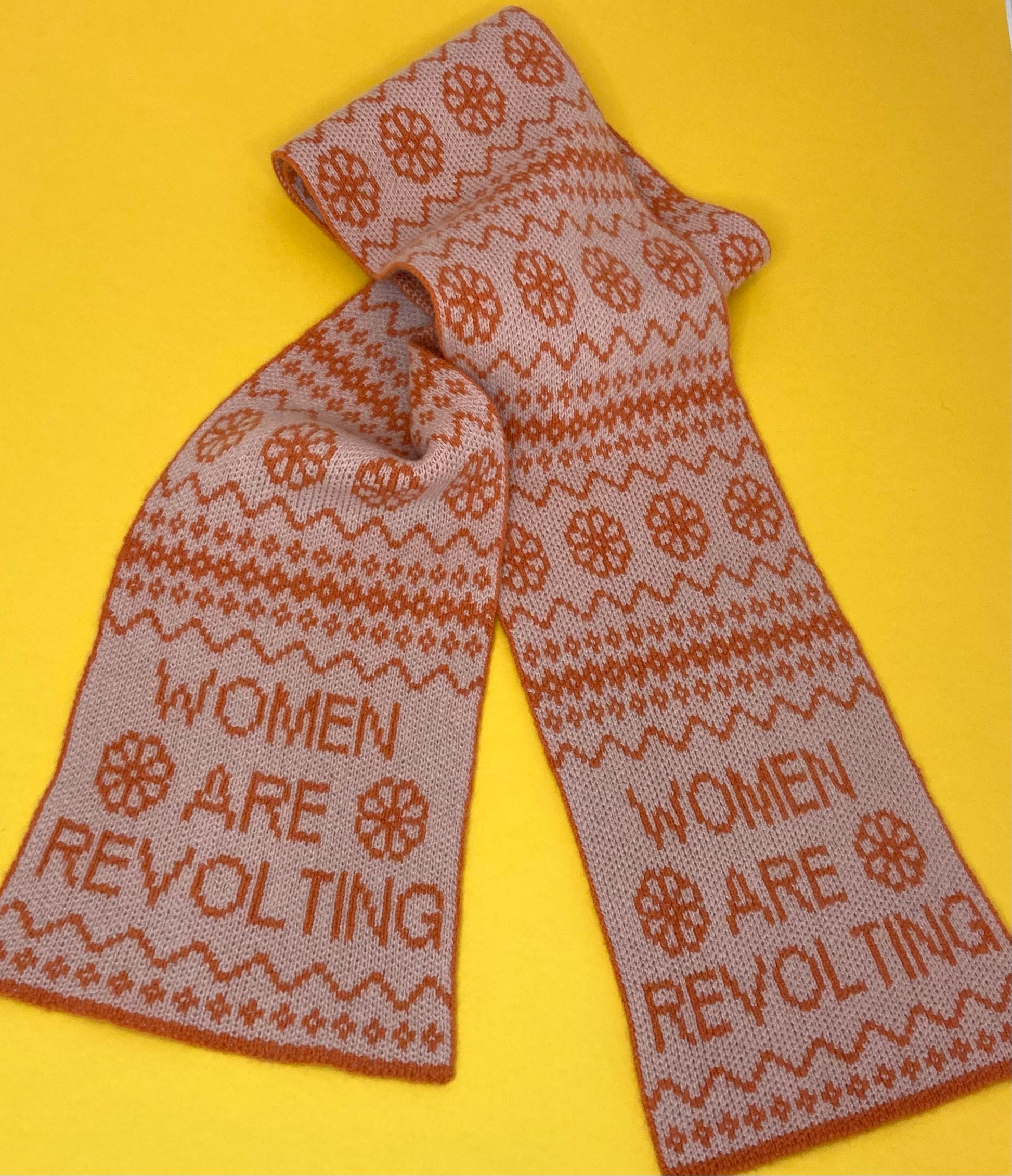 This scarf is my first product to be released from my collaboration with the feminist library in London. This orange and pink design will keep you warm while reminding everyone how powerful women can be, we are revolting and will continue to revolt while there are systems and injustices to revolt against!